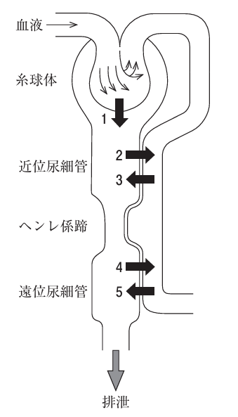 2026.01.14 トランスポーター PR 有機アニオントランスポーターの局在【薬剤師国家試験110回問45】 hachi このサイトは商品プロモーション(Amazonアソシエイト含む)を掲載しています。 下図は腎臓のネフロンを模式的に示したものである。図中の1~5のうち、有機アニオントランスポーター(OAT1、OAT3)を介した薬物の輸送を表すのはどれか。1つ選べ。ただし、図中の矢印の向きは薬物が移行する方向を示す。 Q解説・解説 答え:3 OATは薬物を血管⇒尿中に輸送する。 主な基質は フロセミド プロベネシド ロスバスタチンCa メトトレキサート シプロフロキサシン アモキシシリン パラアミノ馬尿酸(PHA) 詳しい覚え方は以下の記事を参考にして下さい。 関連記事【ゴロより記憶に残る】有機カチオン&ア二オントランスポーター基質薬物の覚え方 記事が役に立ったら拡散お願いします!ブログ更新の励みになります。 役に立ったらシェア! カテゴリーカテゴリー カテゴリーを選択 OTC (4) Uncategorized (73) アミノ酸 (3) オリジナル問題 (3) パーキンソン病 (3) ビタミン (1) プロドラッグ (6) ラセミ体 (3) 共役系 (1) 制吐薬 (1) 副作用 (1) 勉強方法 (13) 化学 (31) 医薬品化学 (2) 大学生活 (4) 官能基 (2) 実習 (1) 抗ウイルス薬 (3) 抗がん剤 (2) 抗ヒスタミン薬 (3) 潰瘍性大腸炎 (1) 物理 (5) 生化学 (3) 生物 (1) 白金製剤 (2) 立体化学 (1) 薬剤 (6) 薬物動態 (3) トランスポーター (3) 薬物間相互作用 (12) 薬理 (18) H2ブロッカー (1) NSAIDs (4) 副作用 (2) 局所麻酔薬 (1) 抗うつ薬 (1) 血液凝固 (3) 衛生 (5) 覚え方 (2) 計算問題 (2) 過去問まとめ (10) 酸化数 (1) 酸性度・塩基性度 (16) アーカイブ アーカイブ 月を選択 2026年1月 (7) 2025年12月 (10) 2025年11月 (1) 2025年10月 (1) 2025年9月 (11) 2025年8月 (1) 2025年7月 (6) 2025年6月 (26) 2025年5月 (5) 2025年4月 (15) 2025年3月 (76) 2025年2月 (5) 2025年1月 (6) 検索検索 ABOUT ME ハチ薬剤師XInstagramContactー経歴ー ・106回薬剤師国家試験現役合格・107回以降も国試を解き続けてます。 ・大学2年の時に化学を挫折しそうになる ⇒2年間化学に向き合い大逆転(模試の化学で上位1%以内に成長)ー主な実績ー・国試76%(264/345)・国試の年に日本化粧品1級、アロマテラピー検定1級取得・ブログ約150記事