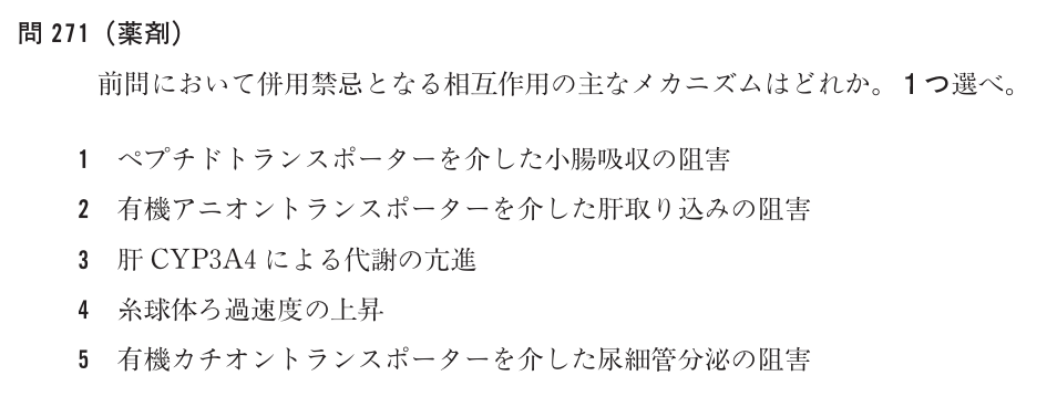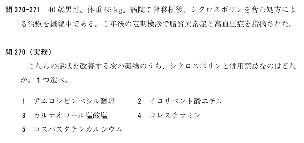 2026.01.15 スタチン PR シクロスポリンと併用禁忌の薬物【薬剤師国家試験99回問270,271】 hachi このサイトは商品プロモーション(Amazonアソシエイト含む)を掲載しています。 Q解説・解説 答え:5 シクロスポリンはロスバスタチンと併用禁忌である。 詳しい解説は問271参照。 Q解説・解説 答え:2 シクロスポリンはOATP1B1を阻害し、ロスバスタチンの血中濃度を上昇させる。 シクロスポリンはフルバスタチンを除き併用に注意を要するので覚えておこう。(下図) 分類【用法・用量・日数・総量】より引用 ハチ ロスバスタチンとピタバスタチンはシクロスポリンと併用禁忌だよ! 他のトランスポーターの問題はこちら 内容が役に立ったらリツイートお願いします。ブログ更新の励みになります。 役に立ったらシェア! カテゴリーカテゴリー カテゴリーを選択 OTC (5) Uncategorized (70) アミノ酸 (3) オリジナル問題 (3) パーキンソン病 (3) ビタミン (1) プロドラッグ (6) ラセミ体 (3) 共役系 (1) 制吐薬 (1) 副作用 (1) 勉強方法 (14) 化学 (39) 反応 (7) 医薬品化学 (10) 大学生活 (4) 官能基 (2) 実習 (1) 抗ウイルス薬 (3) 抗がん剤 (2) 抗ヒスタミン薬 (3) 物理 (9) 分析方法 (4) 生化学 (3) 生物 (5) 染色法 (2) 遺伝子 (1) 病態 (10) ネフローゼ症候群 (1) パーキンソン病 (1) 乳癌 (3) 潰瘍性大腸炎 (1) 統合失調症 (1) 統計 (1) 腹痛 (1) 遺伝子治療 (1) 白金製剤 (2) 確認試験 (2) 立体化学 (1) 薬剤 (6) 薬物動態 (7) トランスポーター (6) 薬物間相互作用 (17) 薬理 (31) H2ブロッカー (1) NSAIDs (4) スタチン (3) ホルモン剤 (3) 副作用 (2) 局所麻酔薬 (1) 抗うつ薬 (1) 抗がん剤 (5) 抗生物質 (1) 禁煙補助薬 (2) 糖尿病 (1) 血液凝固 (3) 衛生 (11) 化管法 (1) 抱合反応 (2) 試験法 (3) 製剤 (2) 粉体 (1) 覚え方 (5) 計算問題 (2) 過去問まとめ (10) 酸化数 (1) 酸性度・塩基性度 (23) アーカイブ アーカイブ 月を選択 2026年2月 (3) 2026年1月 (30) 2025年12月 (10) 2025年11月 (1) 2025年10月 (1) 2025年9月 (11) 2025年8月 (1) 2025年7月 (6) 2025年6月 (26) 2025年5月 (5) 2025年4月 (15) 2025年3月 (75) 2025年2月 (5) 2025年1月 (6) 検索検索 ABOUT ME ハチ薬剤師XInstagramContact・106回薬剤師国家試験現役合格⇒76%(264/345) ・国試模試で化学全国23位 ・Xフォロワー1,400人 ・Threadsフォロワー18人 ・ブログ約180記事 ・国試の年に日本化粧品1級、アロマテラピー検定1級取得
