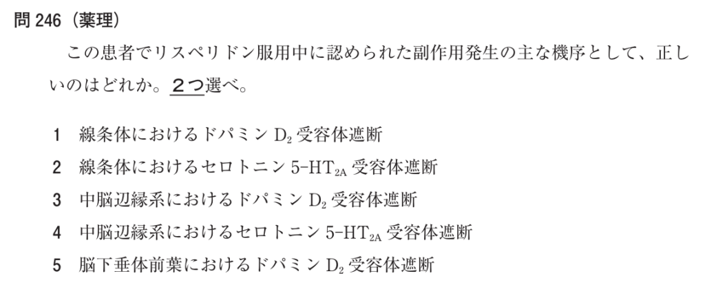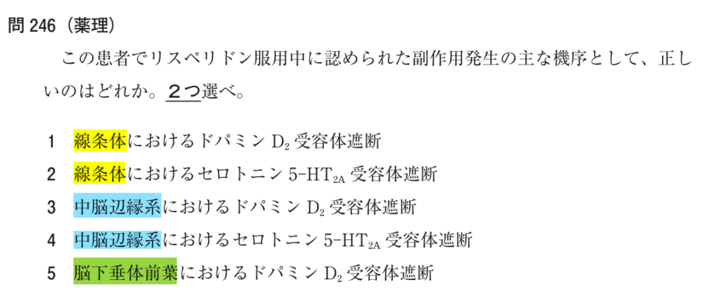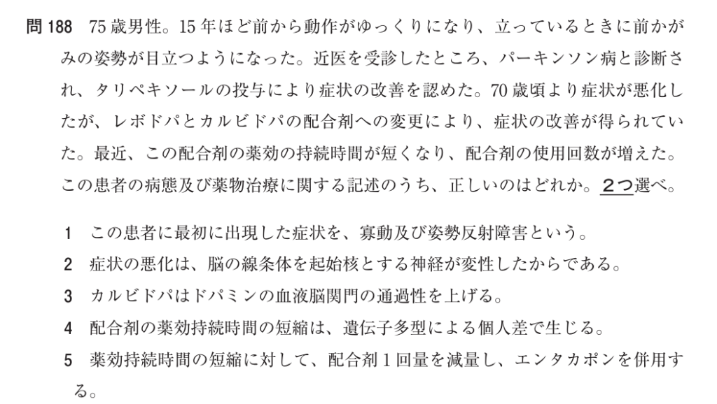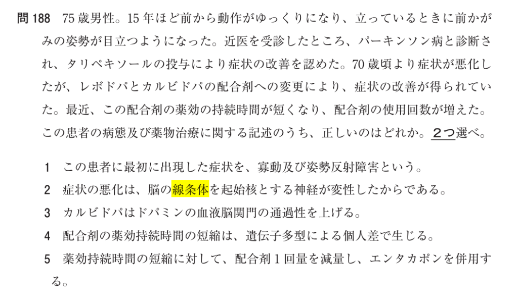 ⇒レボドパがドパミン細胞に保持されずレボドパの持続時間が短くなる。正直、この選択肢だけ見ると難しいが他の選択肢の正誤がしっかり付けられれば問題自体は解ける。
