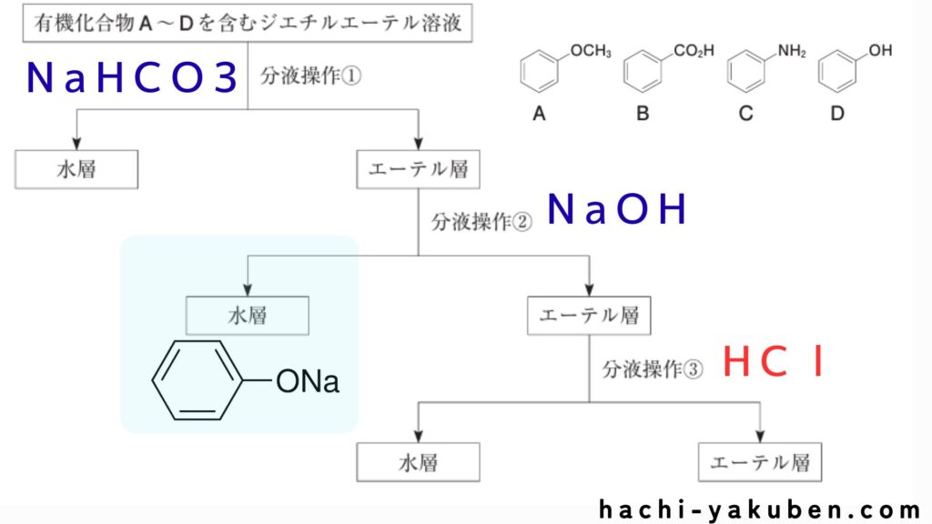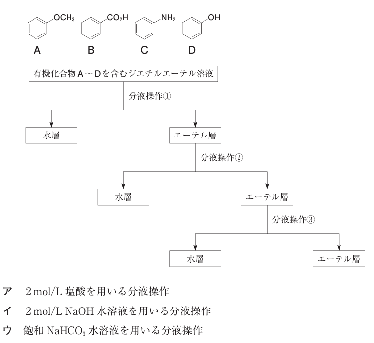 有機化合物A~Dが100mgずつ含まれるジエチルエーテル(エーテル)溶液100mLについて、エーテルと同体積の各水溶液を用いて、分液ロートによる以下の操作を行った