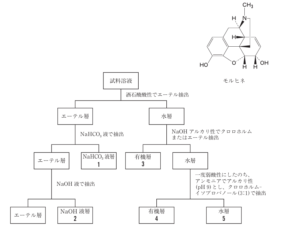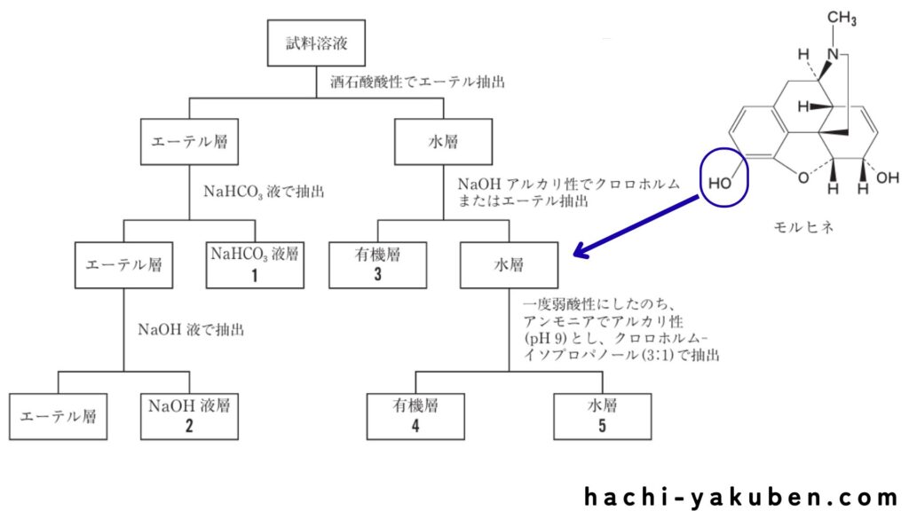 まずは酸性で抽出しているので弱塩基性のモルヒネは水層に移動する。
