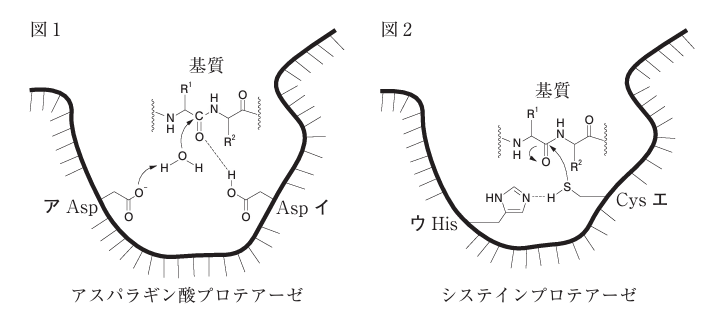 図1及び図2は、アスパラギン酸プロテアーゼ及びシステインプロテアーゼによる基質加水分解の初期反応過程の模式図である。