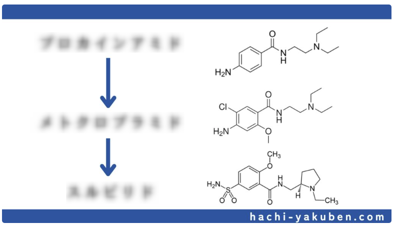また、スルピリドは前述のプロカインアミドからメトクロプラミドの開発を経て創製されました。