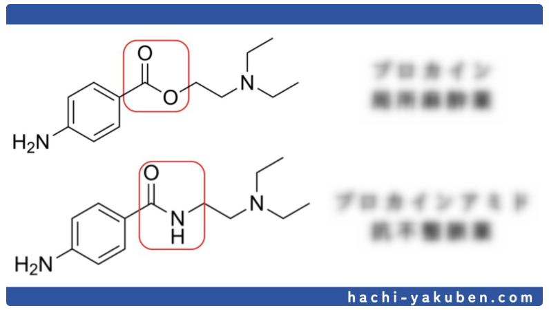 局所麻酔薬のプロカインのエステルをアミド化して加水分解を受けにくくし、作用時間が延長された医薬品です。