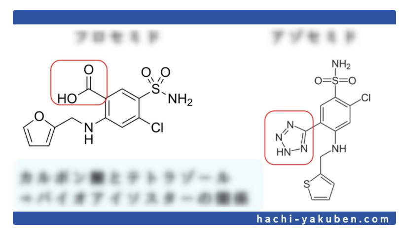 また、アゾセミドはフロセミドのカルボン酸がバイオアイスターであるテトラゾールに置換されているのでここも重要です。
