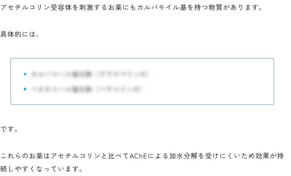これらのお薬はアセチルコリンと比べてAChEによる加水分解を受けにくいため効果が持続しやすくなっています。
