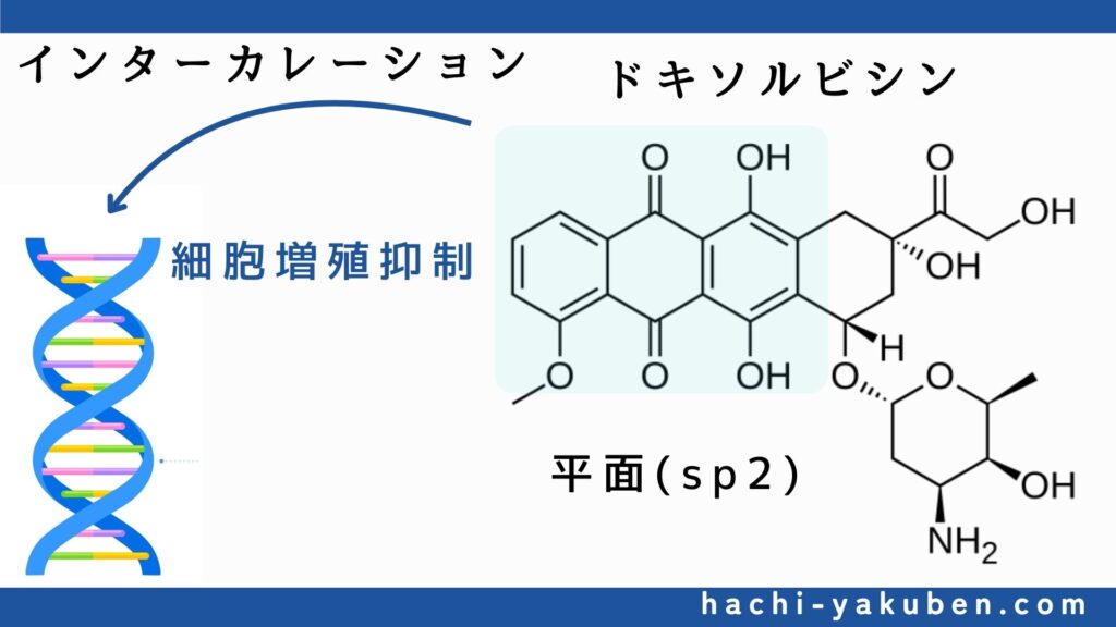 ☆ドキソルビシンは多数のπ結合の存在により、平面構造をとれるのでDNA二重らせんに入り込むことで癌細胞の増殖を抑制する。