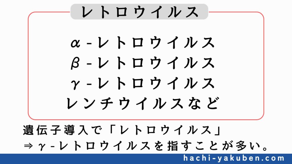 そもそも、レトロウイルス(以下γ-レトロウイルス)・レンチウイルスはレトロウイルスグループに属している。