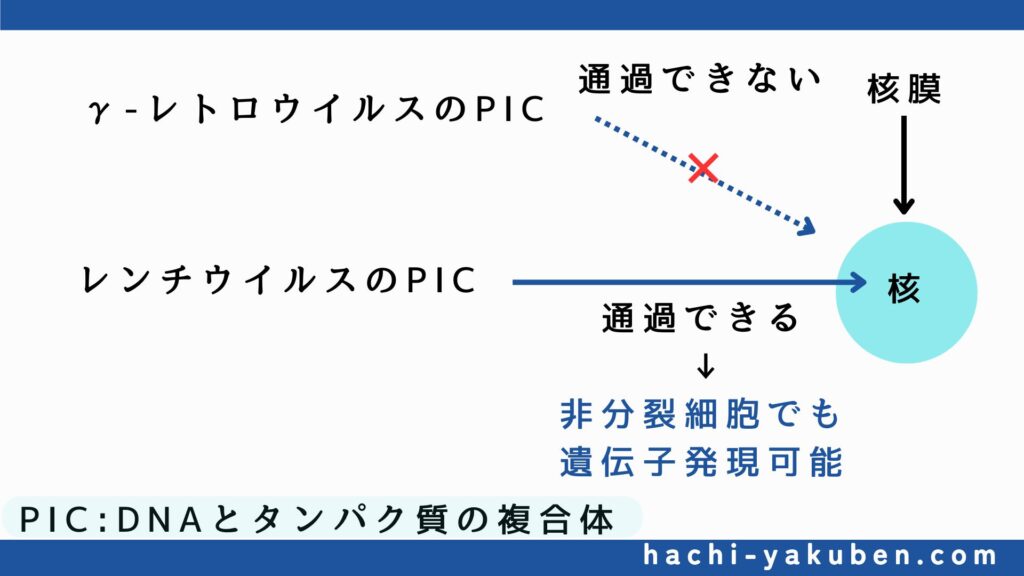 レンチウイルスのPICは核膜を通過できるので、非分裂細胞でも遺伝子発現させることが可能である。