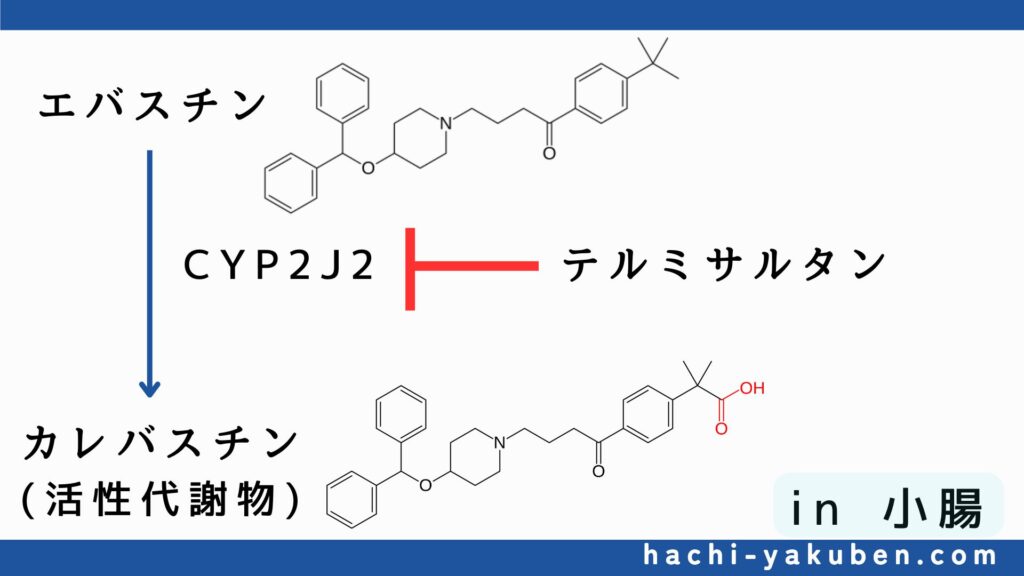 テルミサルタンはCYP2J2の特異的な阻害薬であることから、両者を併用するとカレバスチンへの代謝が抑制され、エバスチンの作用が減弱する可能性がある。